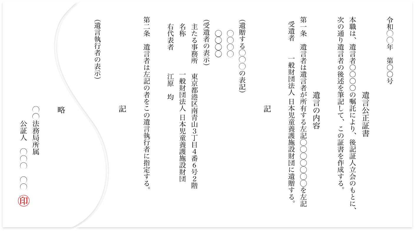 - 遺贈先として「公益財団法人日本児童養護施設財団」を指定された旨をお知らせください。