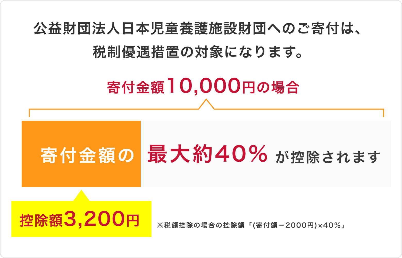 日本児童養護施設財団への寄付金は、「税額控除」か「所得控除」のいずれか有利な方式を寄付者が選択し、寄付金控除を受けることが出来ます。多くの場合、「税額控除」を選択された方が、税額が従来よりも少なくなります。