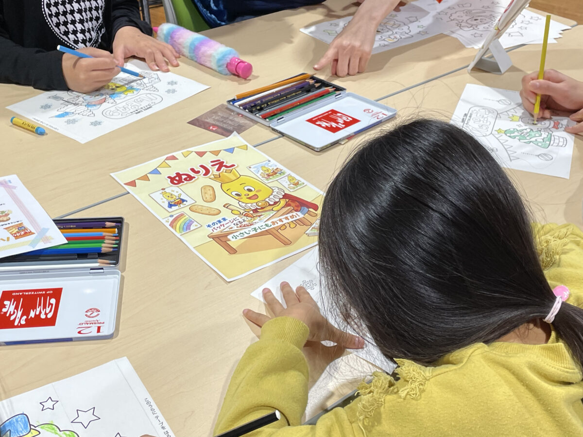 ワークショップでは、塗り絵やポーチ作りに取り組み、子どもたちは自由な発想で制作を行っていました。